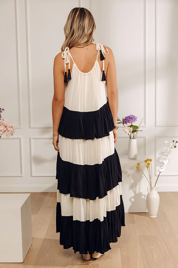 Drama, contrast, and effortless charmāall in one striking silhouette. This tiered maxi dress makes an instant statement with its soft cream base and bold black accents, creating a look that feels playful, polished, and undeniably eye-catching.