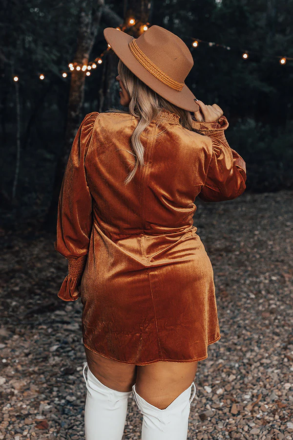 Fashionably Late Velvet Mini Dress In Camel Curves