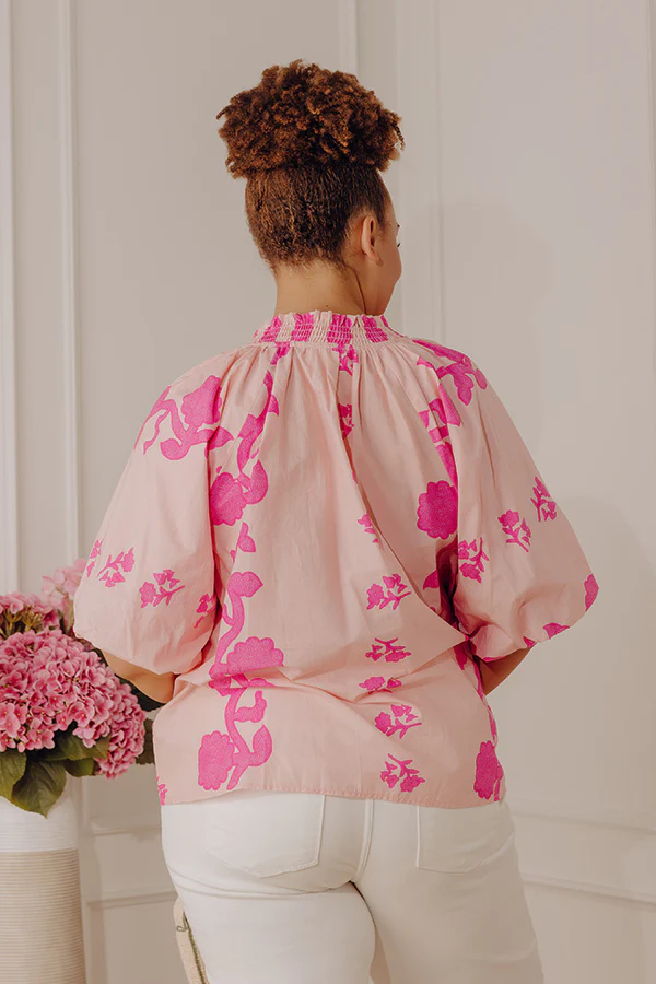 Pretty in pink and full of cheerful charm, this floral top brings a fresh pop of color to your lineup. The soft base is covered in a lively floral print in layered shades of pink, creating a bright, feminine look that feels playful yet polished. A V-cut neckline adds a flattering touch at the front, keeping the silhouette light and easy.
