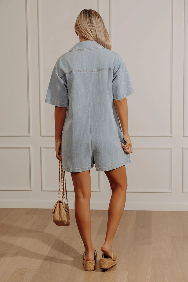 - Be the first in line to show off this cute denim romper! Featuring chic striped denim and a trendy collared neckline, this effortless piece is a must-have for casual chic fashion.