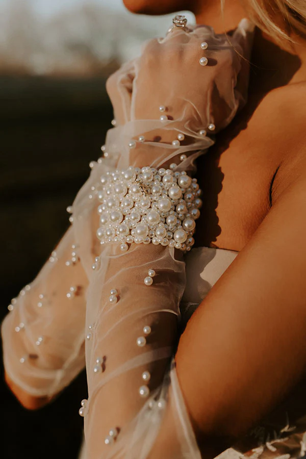 We have no doubt your heart will fall in love with this stunning bracelet featuring a wide faux pearl embellished stretch band!
