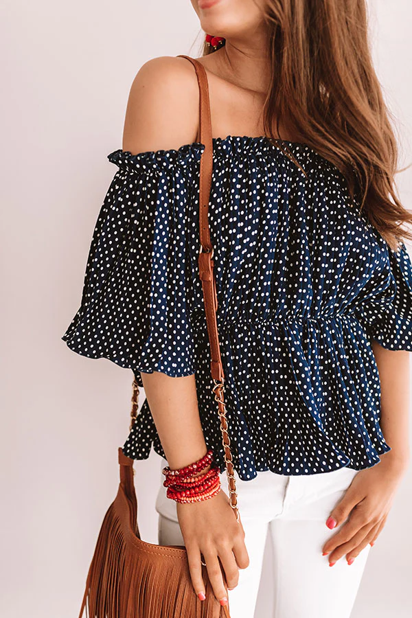 This lavish navy top is adorned with a white polka dot pattern, thick pleated fabric, a ruffled off-shoulder fit, and a cinched elastic waistband with a peplum bottom! This profound piece pairs beautifully with white flared jeans, wedges, and a neutral fringed crossbody for the ultimate Italian sunset style!