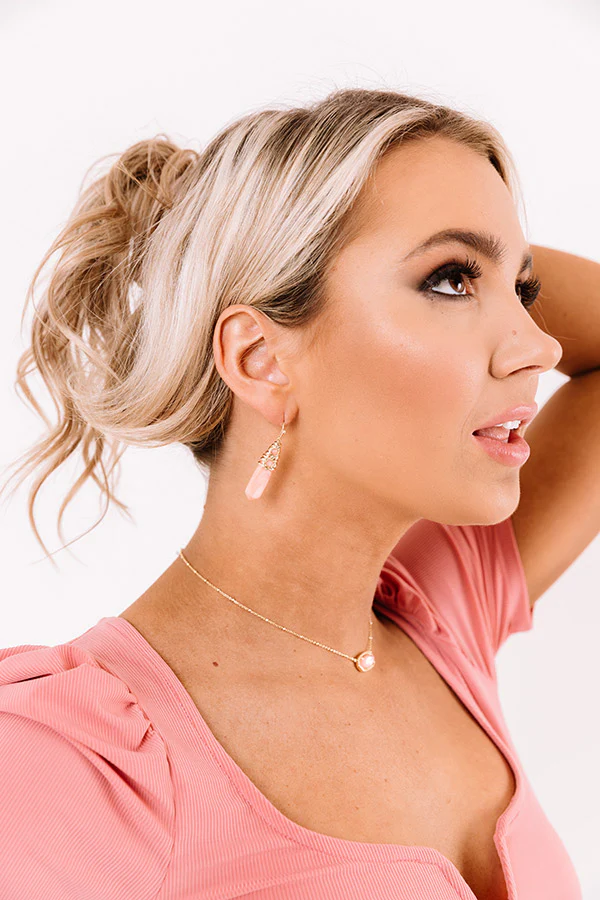 The 'Natalie Gold Drop Earrings in Rose Mother-of-Pearl' are a dainty design with a blend of polished color and metallic textures! Featuring a traditional rattan texture dipped in gold, the 'Natalie Drop Earrings' will add a flair of romance and creative contrast to your everyday look!
