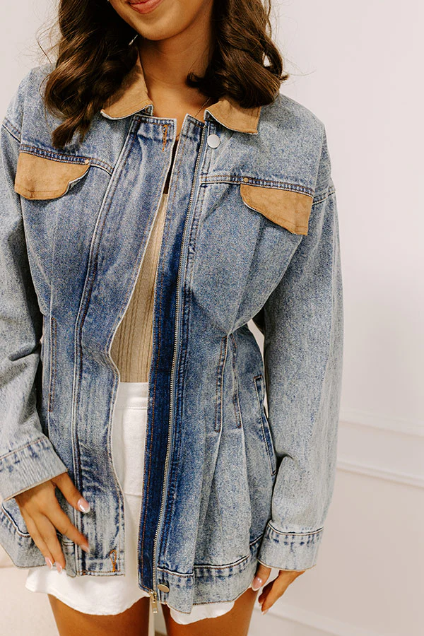 - Cool days call for cool vibes with this trendy denim jacket! Its faux suede details bring a fresh twist to your casual layers.
