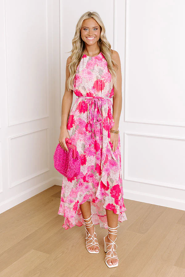 Twirl into style in our beautiful 'Memories On Repeat' midi dress featuring lightweight material patterned with a large hot pink, light pink, stone, and dark olive hued floral print, a high neckline with spaghetti straps, an open slit back with a button closure, a cinched waistline with a tie belt, and a relaxed skirt silhouette that falls into a ruffled mid-calf length tulip hemline!