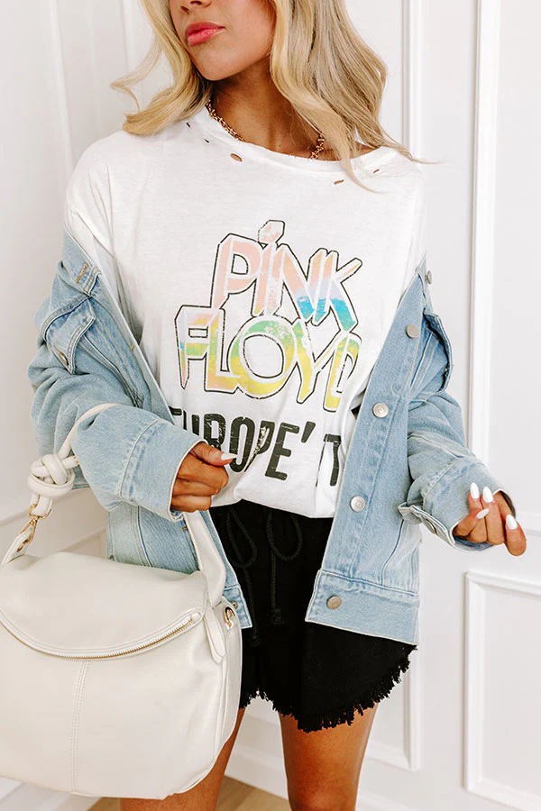 Our white 'Pink Floyd Europe 77' tee features soft lightweight material with distressed detailing, a pastel graphic on the front, a rounded neckline, loose short sleeves, and a slouched silhouette that ends in a straight hemline!