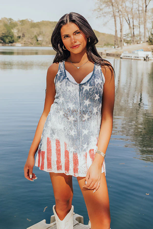 You are guaranteed to look patriotic AND pretty in our adorable 'Red, White, And Blessed Shift Tank' featuring lightweight knit material patterned with a vintage dark red, white, and navy American flag, a scooped neckline, wide sleeveless shoulder straps with a racerback fit, and a slouched silhouette that falls into a straight front hem and a rounded tunic-length back hem! on products