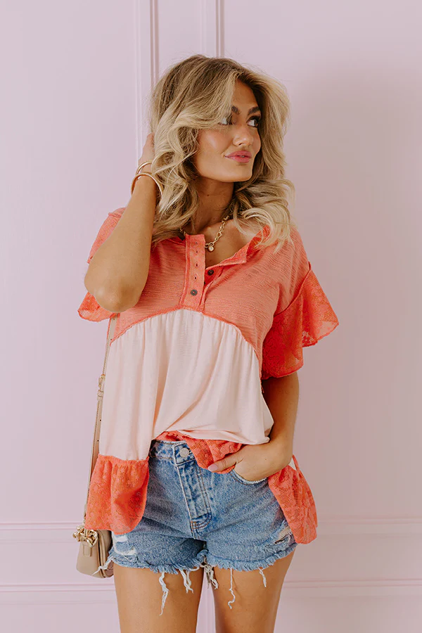 Springtime Sips Lace Babydoll Top In Coral