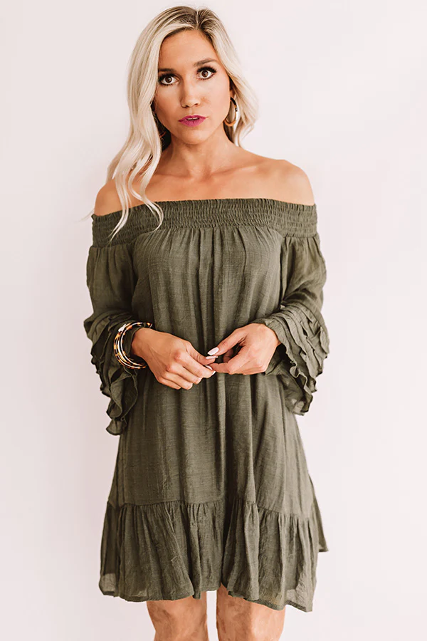You will be sweet tea sippin' and sunshine drippin' in this ary green shift dress featuring flared ruffle sleeves, a smocked off-shoulder fit, and flowy bodice that ends in an oversized hem! Plus, it has a sewn in slip! This adorable piece can be styled with a nude over the knee boot and a leopard clutch for an adorable summer event look or with "The Elena Snake Print Heel" and our "Twist And Shout Snake Print Headband" for a chic summer date look!