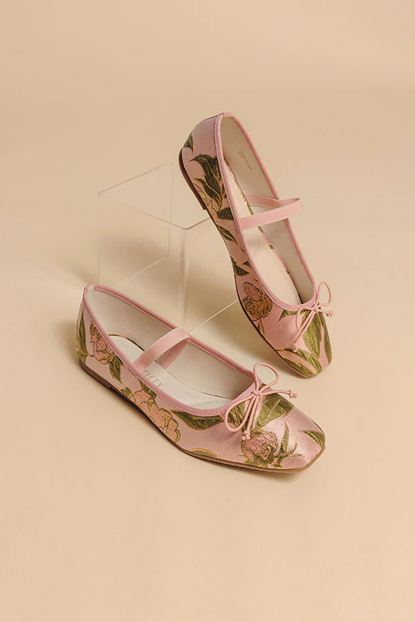 Romantic and timeless, these floral jacquard ballet flats bring a soft, feminine touch to everyday dressing. Designed in a blush pink base with woven floral detailing in muted green and gold tones, this pair feels both elegant and wearable.