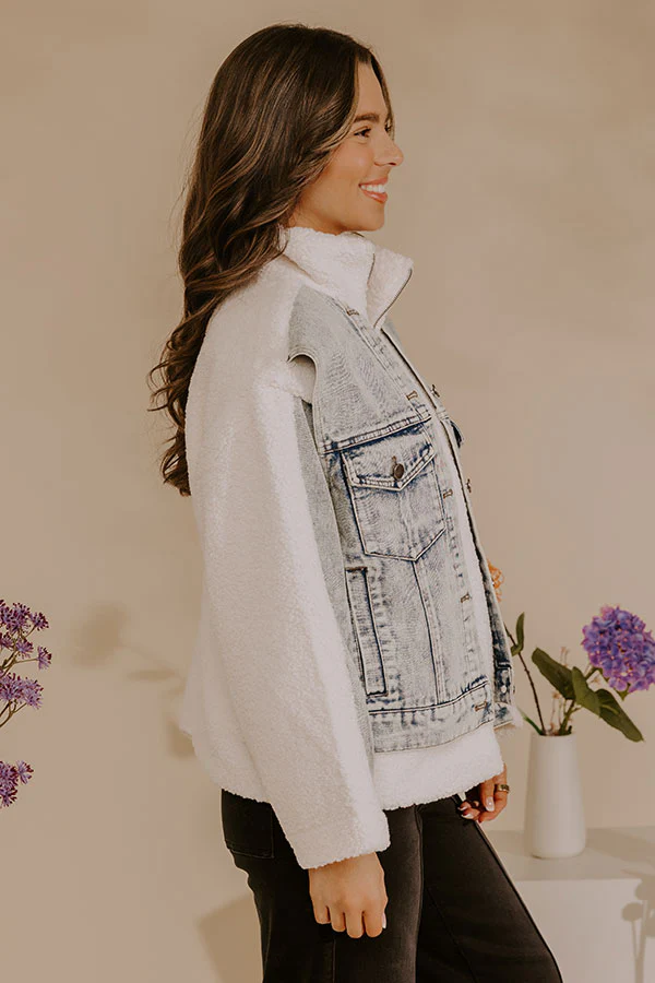 - Stay cute and on-trend in this sherpa jacket with a fun denim twist. It brings an effortlessly cool vibe to any casual moment while keeping your look totally stylish.